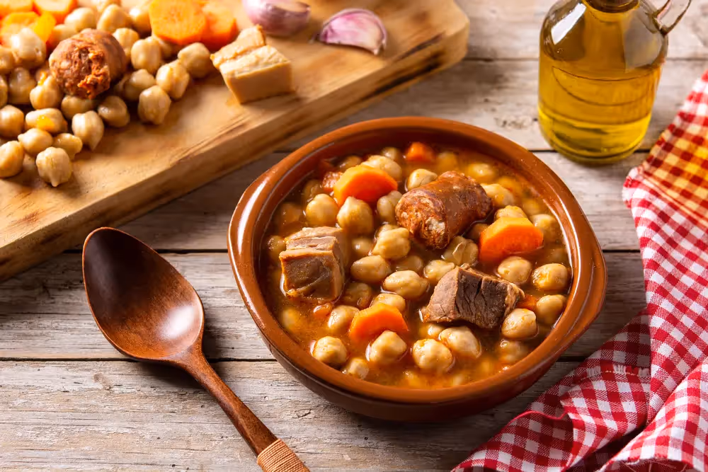 Il cocido madrileño è il piatto più emblematico della cucina madrilena. Questo sostanzioso spezzatino è preparato con ceci, maiale, manzo, chorizo, sanguinaccio e una varietà di verdure come patate, carote e cavoli. Il cocido viene servito in tre portate: prima il brodo, poi i ceci e le verdure e infine la carne. È un piatto perfetto per le giornate fredde e una vera delizia che riflette la tradizione culinaria di Madrid.